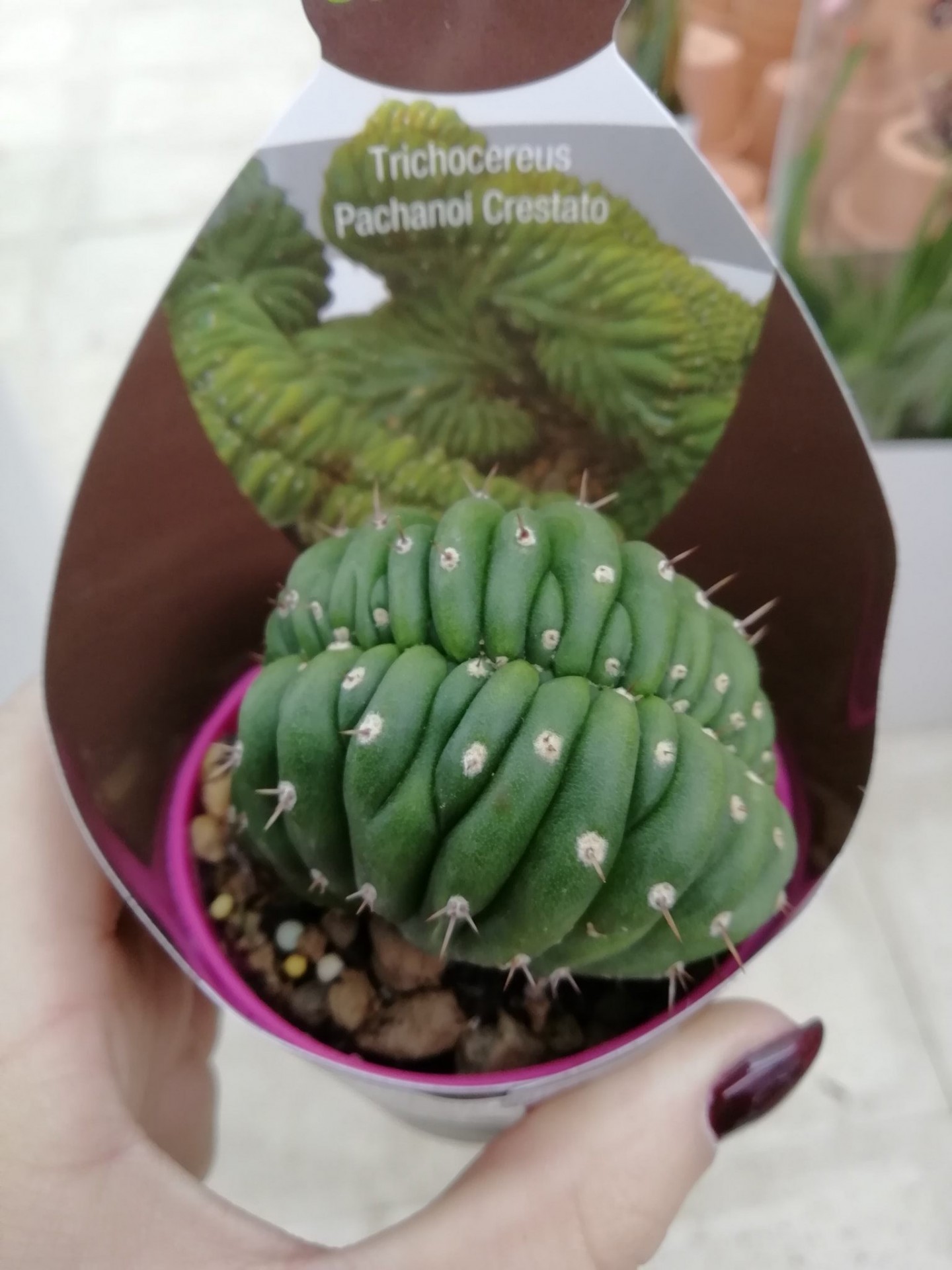 • Cacto verde Trichocereus Pachanoi Crestato em vaso rosa, mostrado de perto