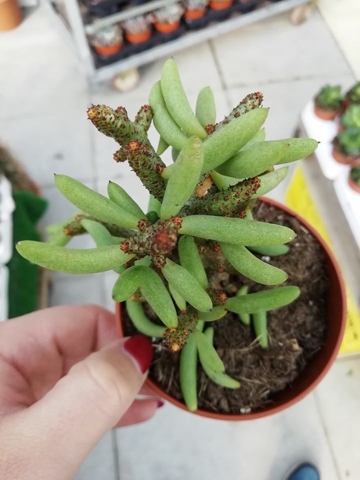 • Suculenta em vaso de plástico castanho segurada por mão com unhas vermelhas