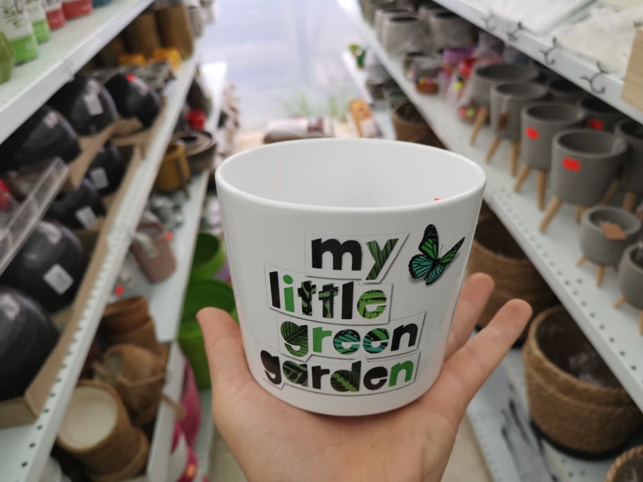 • Vaso cerâmico branco com texto e borboleta, numa mão, em loja de jardim