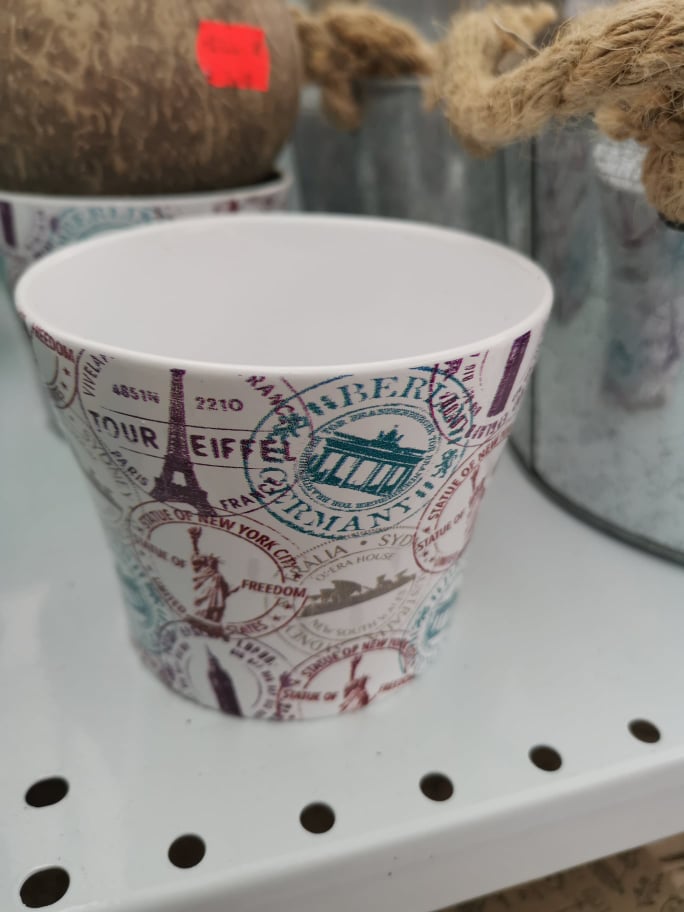 • Copo de papel colorido com estampas de carimbos turísticos sobre prateleira branca