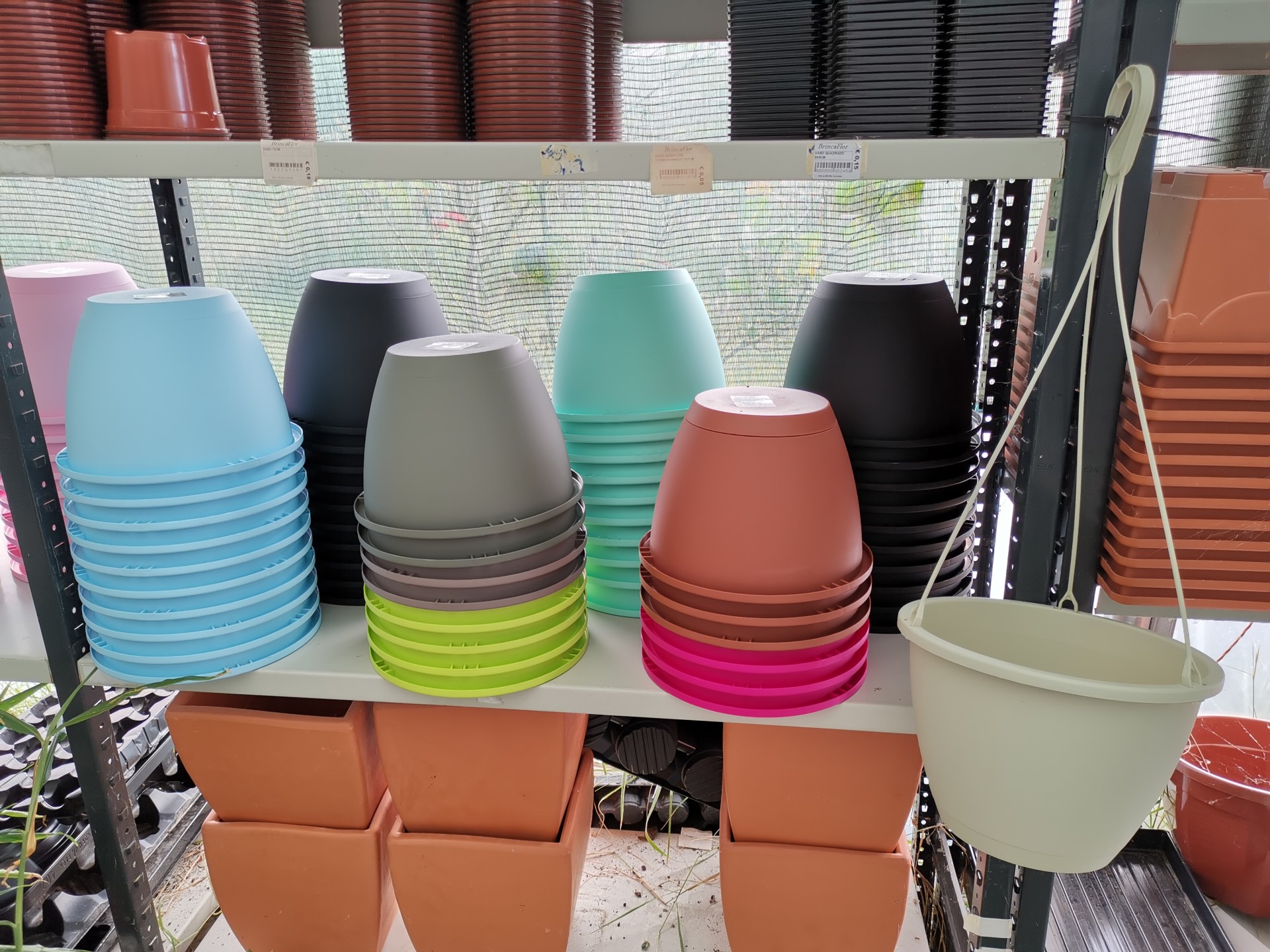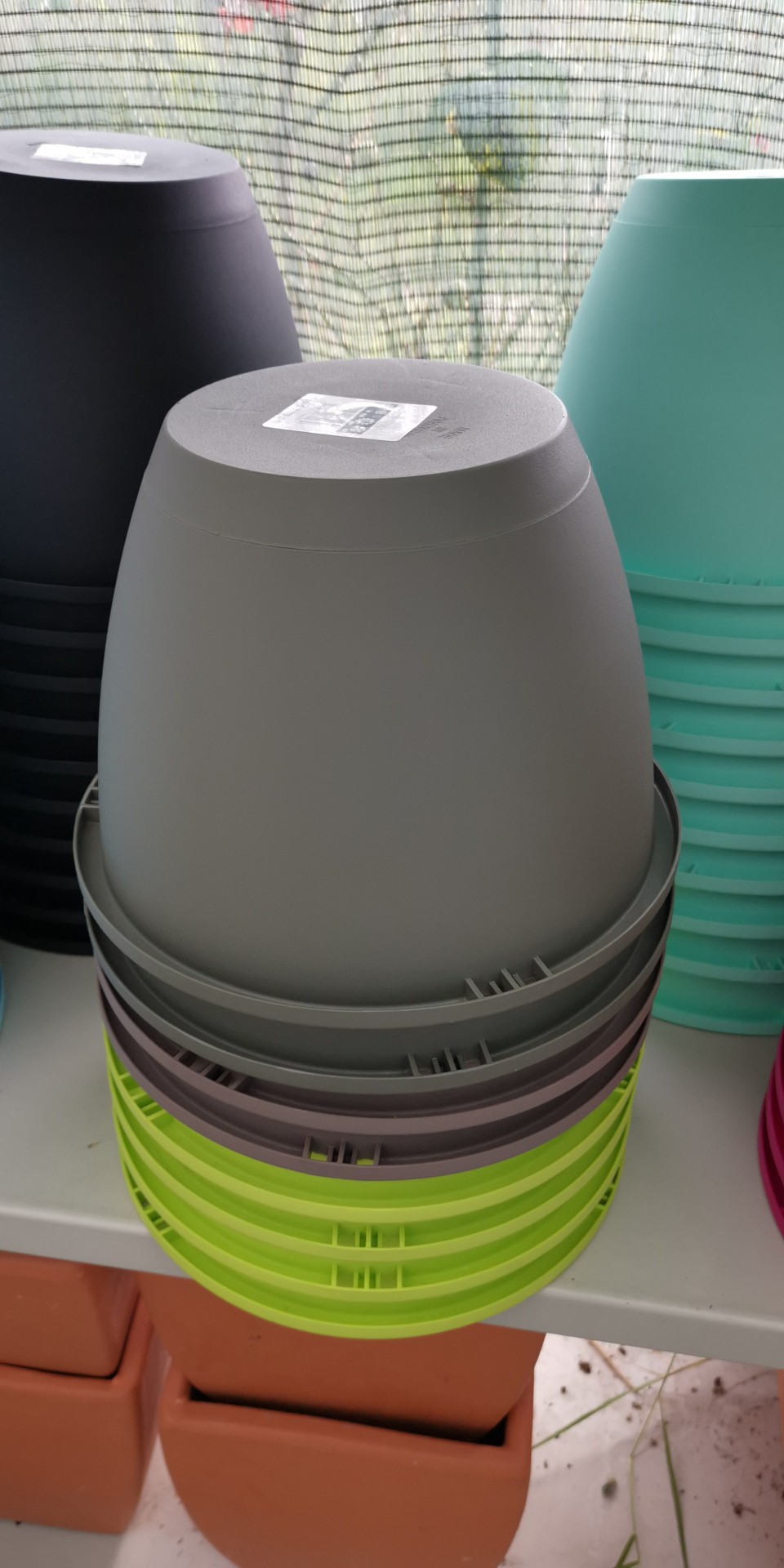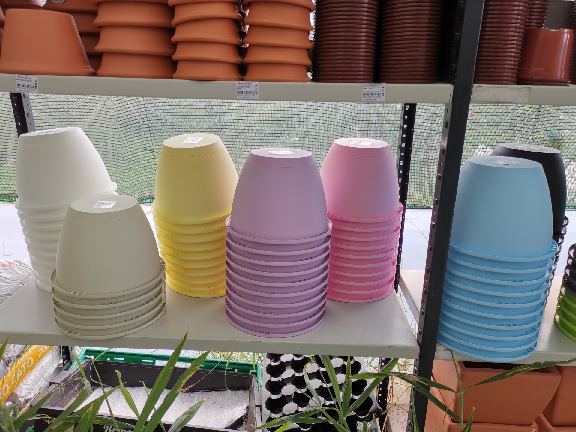 • Conjuntos de vasos de plástico de várias cores pastel empilhados em prateleiras numa loja