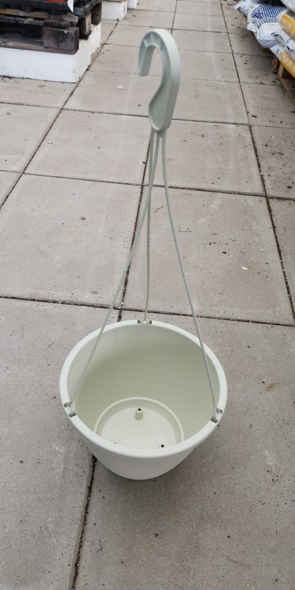 • Vaso branco suspenso com gancho de plástico em pavimento de cimento