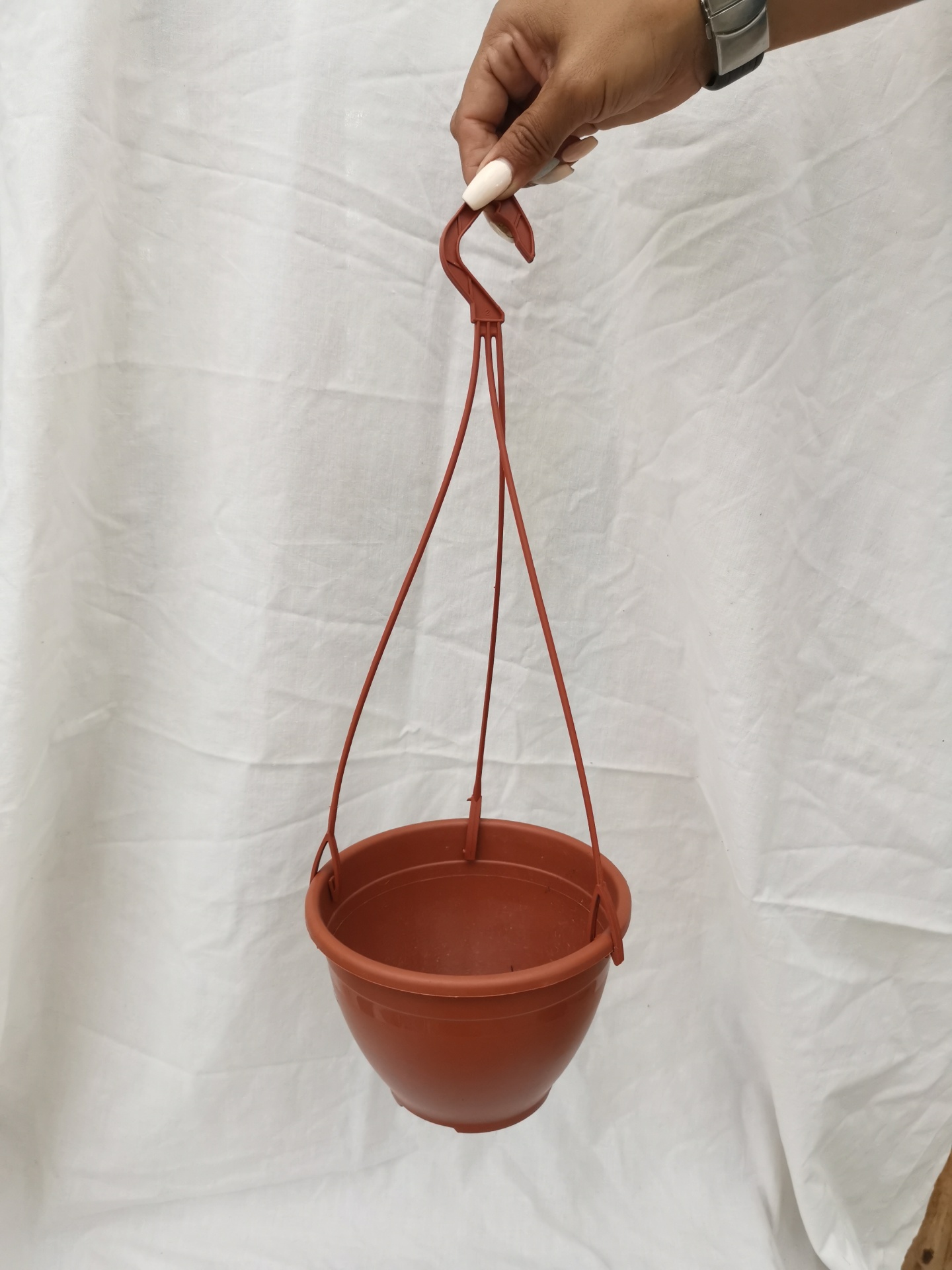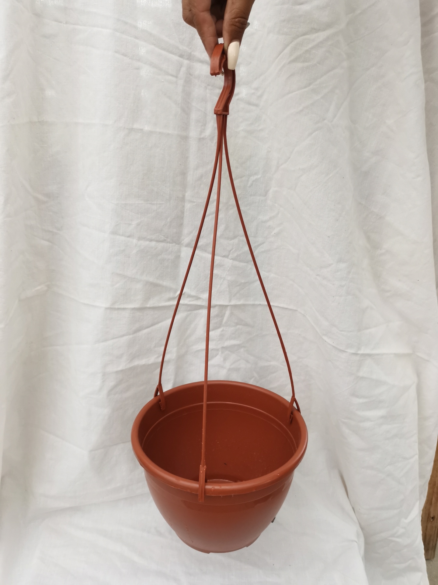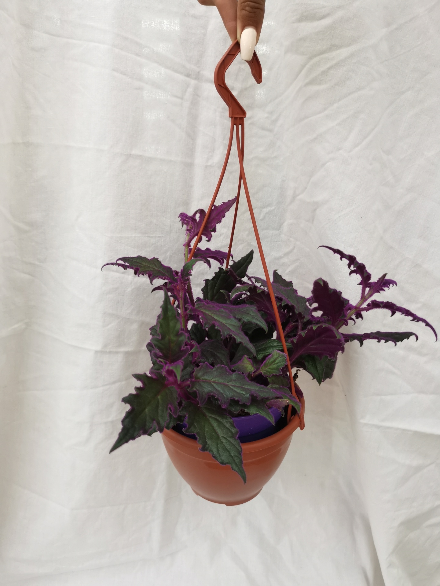 • Vaso suspenso de plástico com planta de folhas verdes e roxas, fundo branco.